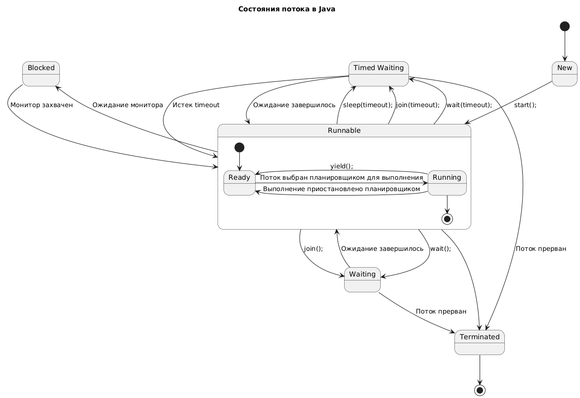 Метод wait() переводит поток в состояние Waiting (или Timed Waiting, если указан таймаут ожидания), а методы notify() и notifyAll() возвращают его в состояние Runnable.
